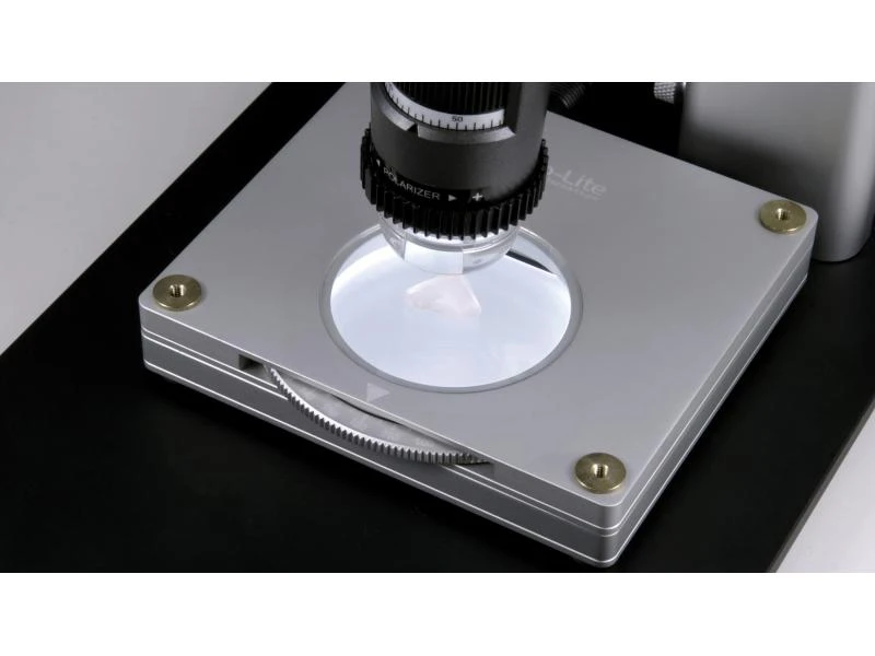 Mit den Polarisationsmikroskopen (AM-413ZT, AM-412NZT oder AD-413ZT) können Sie einfach das eingebaute Polarisationsfilter nutzen. Drehen Sie das Rad an der Vorderseite und betrachten Sie Ihre Proben auch in polarisiertem Licht.
