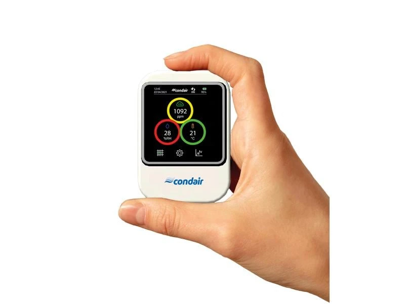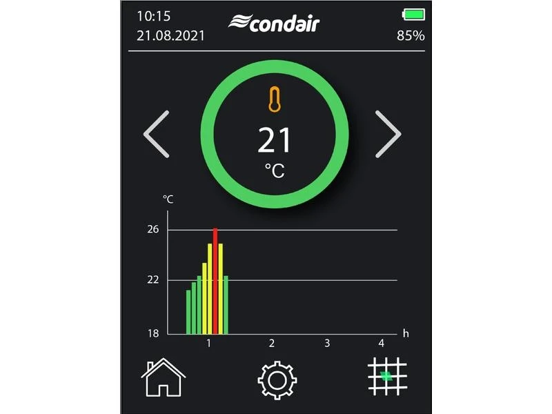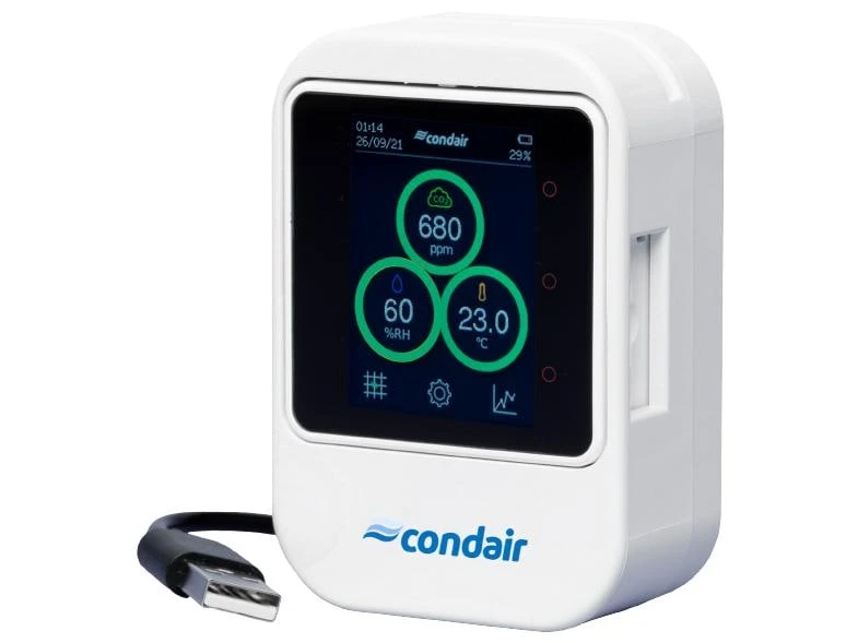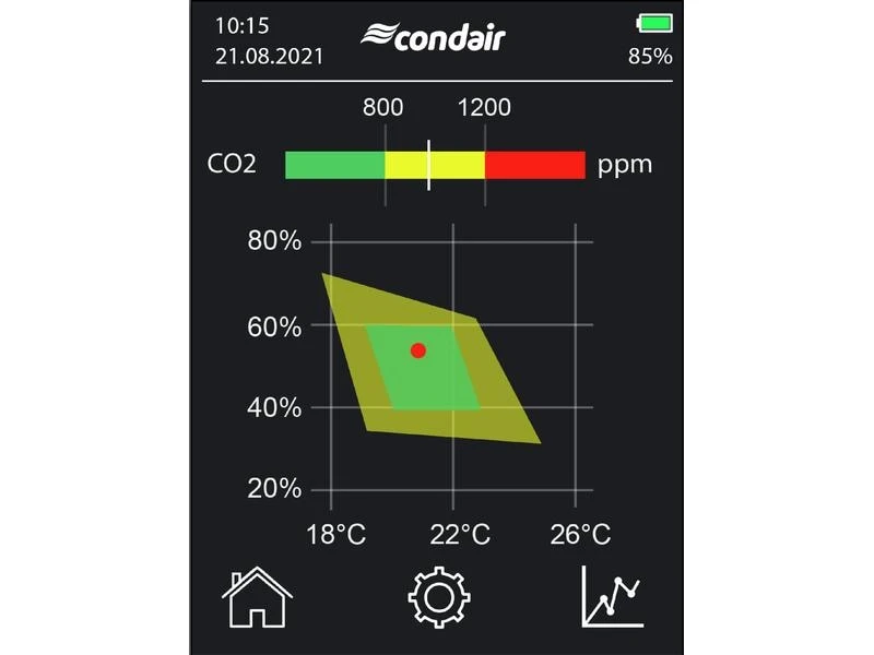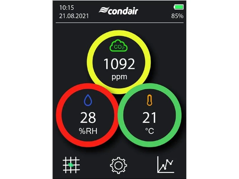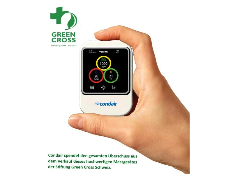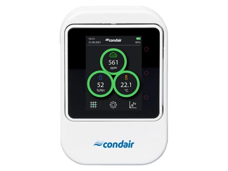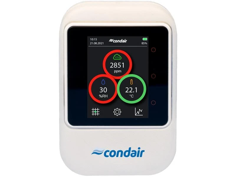 Dank hochqualitativer Sensoren misst der Condair Cube schnell und präzise die Luftqualität – und das überall: Ob nun zu Hause, am Arbeitsplatz, im Restaurant, im Gym, in der Schule oder unterwegs wie im Zug, Bus, Flugzeug oder im Auto. Er hilft Ihnen dabei, das Leben in öffentlichen Räumen sicherer und besser zu gestalten. Dabei genügt ein Blick zur Überwachung des Innenraums. Sie beobachten lediglich die Ampelfarben, stellen so den IST-Zustand rasch fest und können bereits bei gelb entsprechend Handeln und den werten mit dem Öffnen eines Fensters entgegenwirken. So senken Sie nicht nur den CO2-Gehalt im Raum – und folglich auch die Aerosolkonzentration – sondern erlangen auch besseren Schutz vor Krankheitserregern. Nicht umsonst basiert das Ampelsystem des Condair Cube auf Richtwerten von internationalen, wissenschaftlichen Erkenntnissen namhafter Universitäten und Richtlinien.