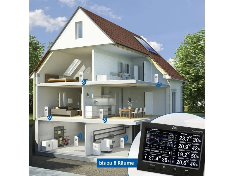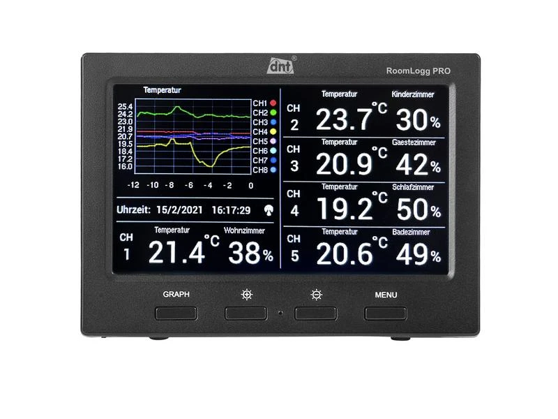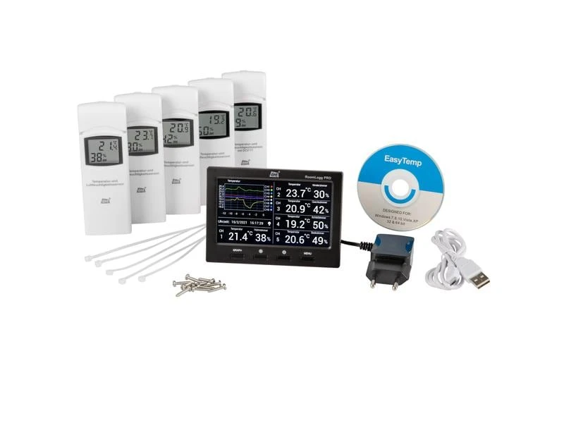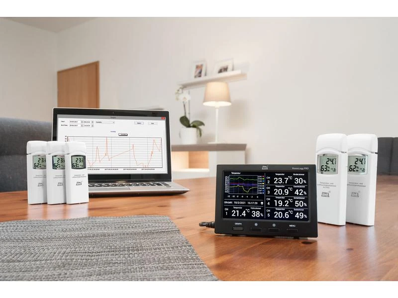 Die hochwertige Raumklimastation RoomLogg PRO punktet mit 5 Thermo-/Hygrosensoren, brillantem TFT-Display mit Verlaufsanzeige, stromausfallsicherem Messwertespeicher und komfortabler PC-Auswertesoftware.