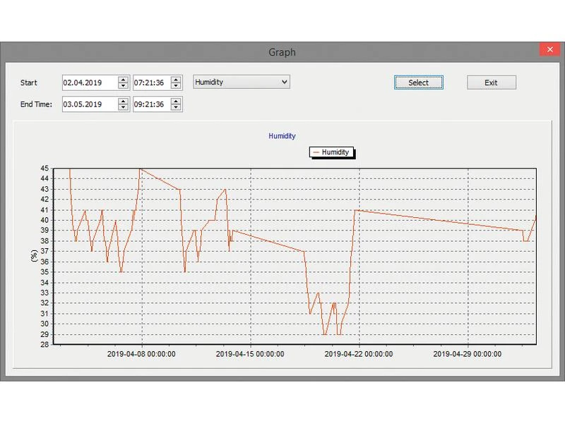 Das grafische Anzeigefeld des brillanten TFT-Displays kann den Verlauf von Temperatur, Luftfeuchte (rH), Taupunkt und Hitze-/Wärmeindex wiedergeben. Sie können den Anzeigezeitraum und die angezeigten Sensordaten via Tasten am Gerät sowie mit der PC-Software einstellen und so auf Ihre individuellen Präferenzen anpassen.