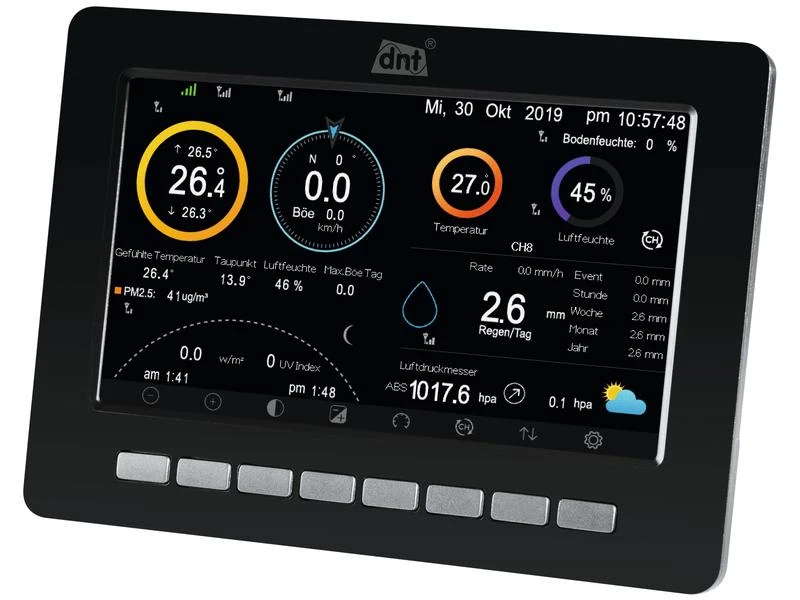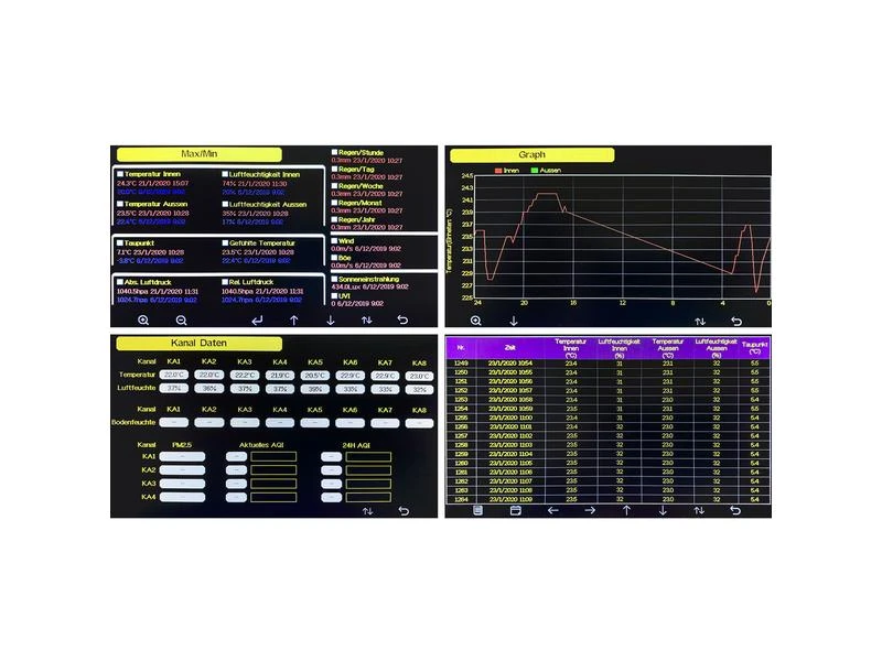 Neben der übersichtlichen Darstellung aller relevanten Wetterdaten sind umfangreiche tabellarische und grafische Datenanzeigen möglich. Daten zu Niederschlag, Windgeschwindigkeit/-richtung, Innen-/Aussenluftfeuchtigkeit, Luftdruck, Innen-/Aussentemperatur sowie Beleuchtungsstärke können zudem auf eine einsetzbare microSD-Speicherkarte geloggt und am PC verarbeitet werden.