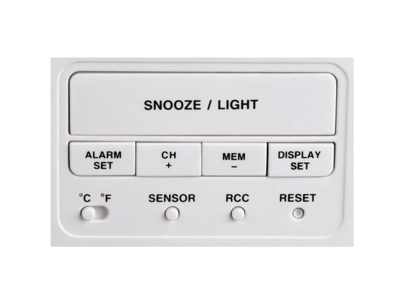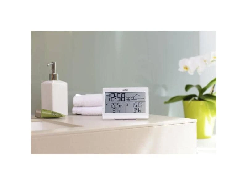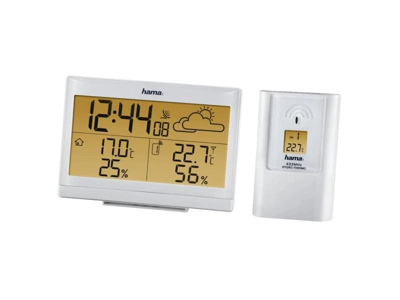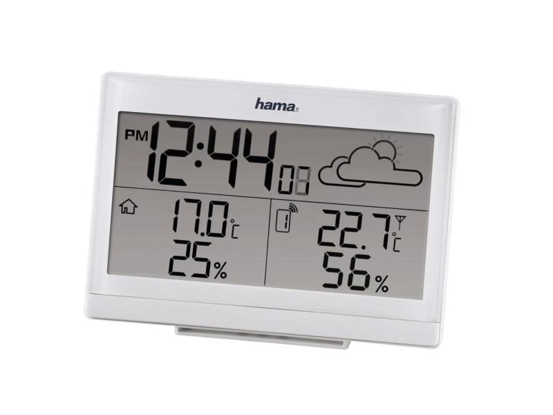 Die elektronische Wetterstation EWS-890 von Hama vereint eine digitale Temperaturanzeige, Wettervorhersage und Luftfeuchtigkeitsmessung, sodass Sie wettertechnisch immer auf dem Laufenden sind. Über das LC-Display mit orangefarbener Hintergrundbeleuchtung lassen sich die Innen- und Aussentemperatur von -20° bis +55 °C, die Luftfeuchtigkeit zwischen 20 und 90 % und die Uhrzeit im 12-/24-Stundenformat ablesen. Die Temperaturanzeige ist zwischen °C und °F wählbar. Zwischen -2 und + 3 °C blinkt der Frostalarm. Zur weiteren Ausstattung gehört eine Schlummer- und Weckfunktion. Das Wetter wird Ihnen mit vier Symbolen angezeigt. Sie erhalten die Wetterstation inklusive Aussensensor, Bedienungsanleitung und vier AA-Batterien.