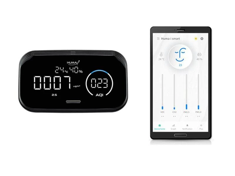 Der Huma-i smart HI-300 ist mit einem Sensor für Kohlendioxid und flüchtige organische Verbindungen ausgestattet und ermöglicht genaue Messung von CO2 und VOC in Echtzeit. Darüber hinaus können PM1.0/PM2.5/PM10/Temperatur/Feuchtigkeit gemessen werden. Über die WLAN-Netzwerkverbindung können Sie verschiedene Luftqualitätswerte jederzeit mit der App überprüfen und verwalten. HI-300 kann Ihnen helfen, Ihre Lebensqualität durch die Verwaltung der gemessenen Daten der letzten 90 Tage zu verbessern. Erhalten Sie Echtzeit-Benachrichtigungen über Änderungen der Luftqualität sowie Wetterinformationen.