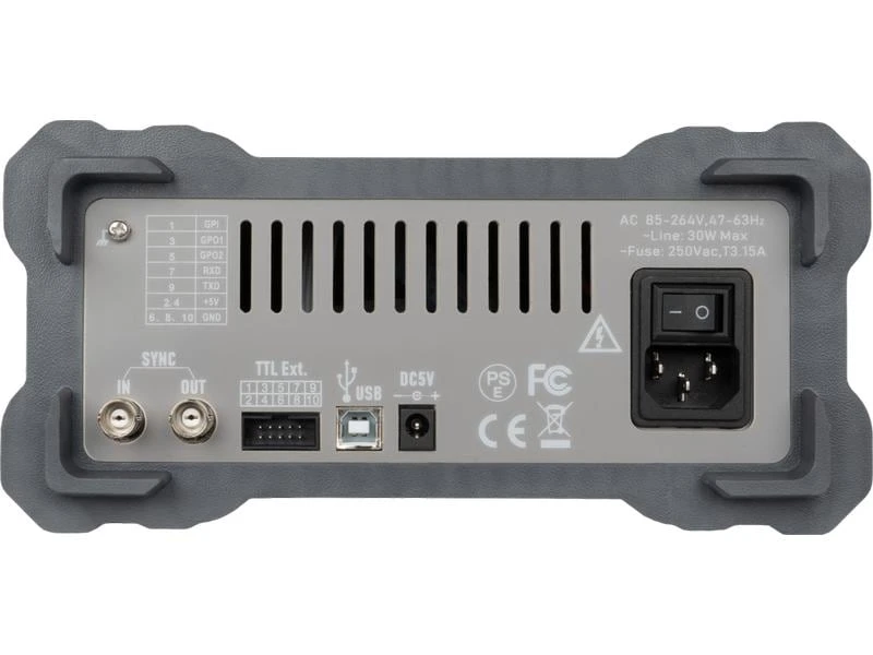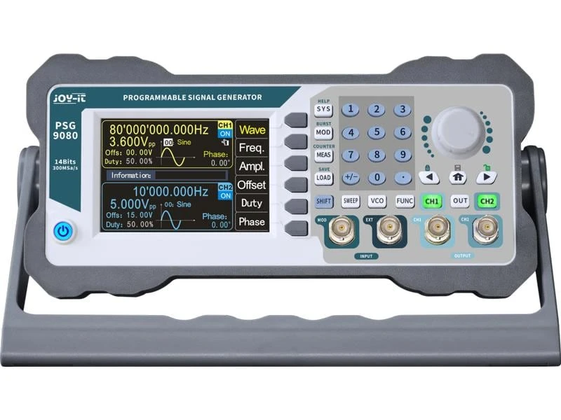 Das Gehäuse ist hochwertig verarbeitet und bietet rutschfeste Standfüsse, um ein angenehmes Arbeiten zu ermöglichen. Unterschiedliche Signalmodulationsverfahren, wie z. B. Frequenzmodulation, Phasenmodulation, Amplitudenmodulation, Pulsweitenmodulation, Frequenzumtastung, sind mit diesem Gerät keine Herausforderung mehr. Die integrierte Messfunktion ermöglicht es ausserdem die Frequenz, Perioden- und Einschaltdauer von externen Signalen zu messen und in Echtzeit auf dem Bildschirm anzeigen zu lassen.