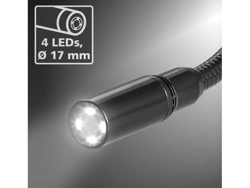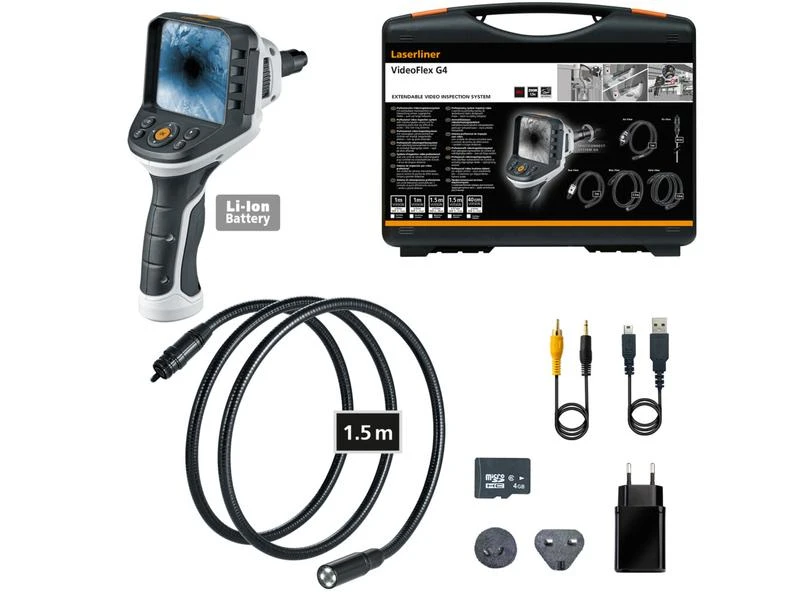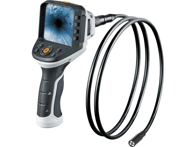 Das professionelle Videoinspektionssystem VideoFlex G4 Max ermöglicht visuelle Kontrollen schwer zugänglicher Stellen, beispielsweise in Rohrleitungen, Wandhohlräumen und Kraftfahrzeugen. Durch intuitives Drehen der Basiseinheit hat der Anwender eine einfache räumliche Orientierung. Mit effektiver LED-Objektbeleuchtung gelingen selbst unter schlechten Bedingungen hervorragende Aufnahmen. Aufgrund einer naturtreuen Wiedergabe von Farben wird eine realitätsnahe Darstellung geboten. Details lassen sich über die Zoom-Funktion klar erfassen. Das ergonomisch designte Gerät liegt gut in der Hand und ist auch bei längeren Arbeiten angenehm zu nutzen. Acht verfügbare Sprachen und die kompakte, wechselbare Kameraeinheit sorgen für vielfältige Einsatzmöglichkeiten. Eine SD-Speicherkarte dient zur Dokumentation und die USB-C-Schnittstelle zum Auswerten der Bilder und Videos.