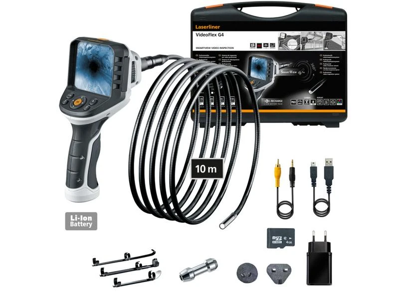 Das professionelle Videoinspektionssystem VideoFlex G4 Ultra ermöglicht visuelle Kontrollen an schwer zugänglichen Stellen, beispielsweise in Rohrleitungen, Wandhohlräumen und Kraftfahrzeugen. Der Anwender hat eine einfache räumliche Orientierung durch intuitives Drehen der Basiseinheit. Für den Einsatz auf grosser Distanz ist der extrem lange 10 Meter Flexschlauch ideal. Mit effektiver LED-Objektbeleuchtung gelingen selbst unter schlechten Bedingungen hervorragende Aufnahmen. Aufgrund einer naturtreuen Wiedergabe von Farben wird eine realitätsnahe Darstellung geboten. Details lassen sich über die Zoom-Funktion klar erfassen. Das ergonomisch designte Gerät liegt gut in der Hand und ist auch bei längeren Arbeiten angenehm zu nutzen. Acht verfügbare Sprachen und die wechselbare Kameraeinheit sorgen für vielfältige Einsatzmöglichkeiten. Eine SD-Speicherkarte dient zur Dokumentation und die USB-C-Schnittstelle zum Auswerten der Bilder und Videos.