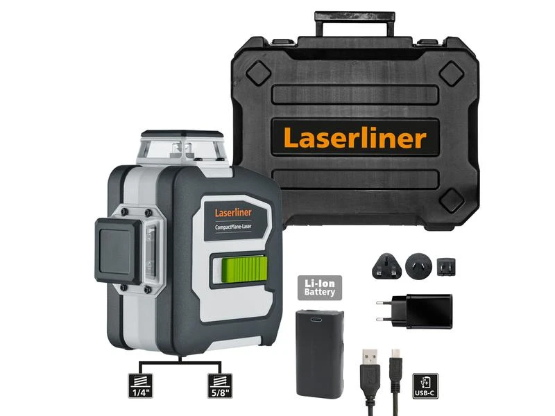 Der CompactPlane-Laser 3G Pro ist ein dreidimensionaler grüner Laser mit einem horizontalen und zwei vertikalen Laserkreisen sowie Digital Connection-Schnittstelle. Er eignet sich optimal zum genauen Ausrichten von Gegenständen. Mit der grünen Lasertechnologie wird selbst bei ungünstigen Lichtverhältnissen eine hohe Sichtbarkeit geboten. Gefälle lassen sich mit der manuellen Neigungsfunktion einfach ausrichten. Per Digital Connection-Schnittstelle und der kostenlosen Commander App kann der Laser komfortabel ferngesteuert werden. Durch die effektive Vermeidung von Messfehlern mit der Tilt-Funktion liefert das Gerät eine hohe Messsicherheit.Durch den integrierten Handempfänger-Modus kann der Betrieb auch mit einem optionalen Laserempfänger erfolgen, ideal für Aussenanwendungen und grosse Reichweiten. Eine Pendelarretierung sorgt für guten Schutz beim Transport. Das Gerät ist mit 1/4?- und 5/8?-Stativanschlüssen ausgestattet und kann über die USB-C-Schnittstelle aufgeladen werden.