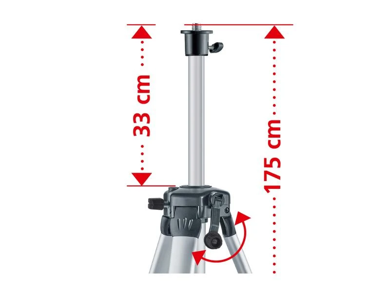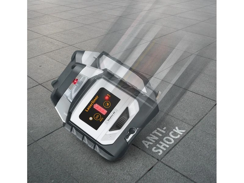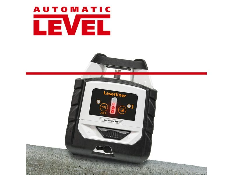 Das Duraplane 360 Set 175 cm beinhaltet einen roten, robusten, horizontalen 360°-Linienlaser mit Anti-Drift-System, inklusive Laserempfänger RangeXtender 60, Kompaktstativ 175 cm und Teleskop-Nivellierlatte 3 m
