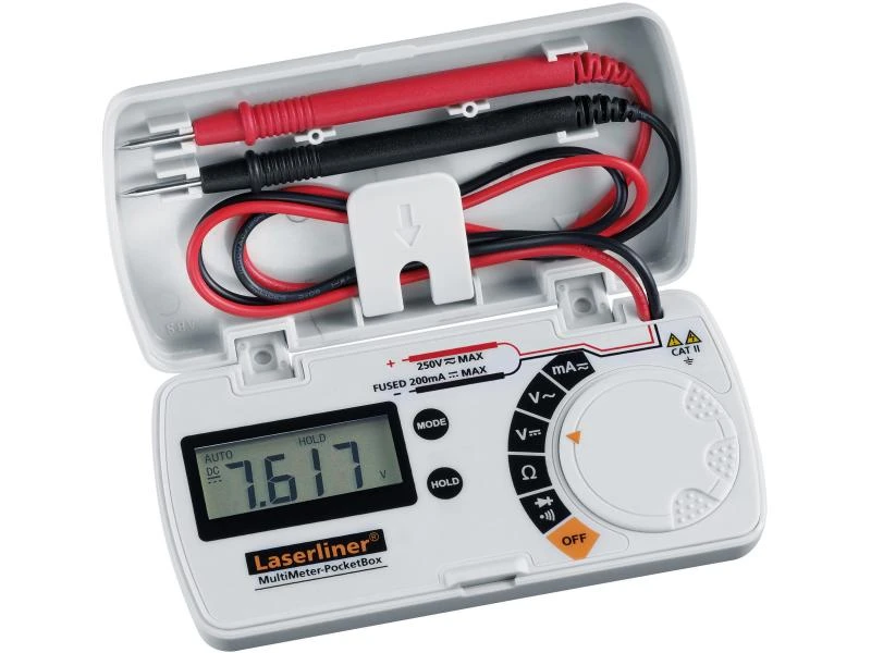 Die MultiMeter PocketBox von Laserliner misst zuverlässig und sicher Spannung, Strom und Widerstand Ihrer Elektrogeräte. Das Prüfgerät verfügt über einen automatischen Durchgangstester mit akustischem Signalton sowie über eine Diodentest-Funktion zur Funktions- und Polaritätsbestimmung. Die Messspitzen sind bereits in der Box integriert und das Gerät schaltet automatisch zwischen den verschiedenen Bereichen um. Die gemessenen Werte werden auf dem LC-Display angezeigt und können mithilfe der Hold-Funktion festgehalten werden.