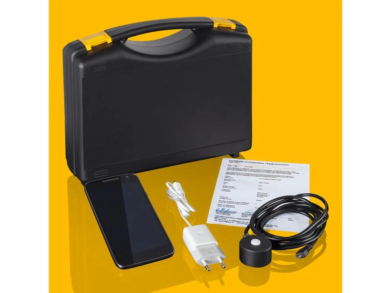 - Bestehend aus kalibriertem UV-Sensor, Kalibrierzertifikat, Android-Smartphone, Ladegerät und einem Transportkoffer