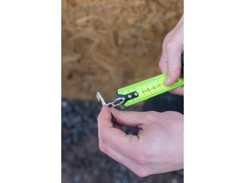 Das Massband verfügt über einen automatischen Rücklauf, der das Band innerhalb von Sekunden aufrollen kann. Über die Feststelltaste kann eine bestimmte Länge eingestellt werden. Durch den grossen, verschiebbaren Haken kann das Produkt für Innen- und Aussenmessungen genutzt werden. Die Anwendungsmöglichkeiten lassen sich durch den aufsetzbaren XL-Haken erweitern.