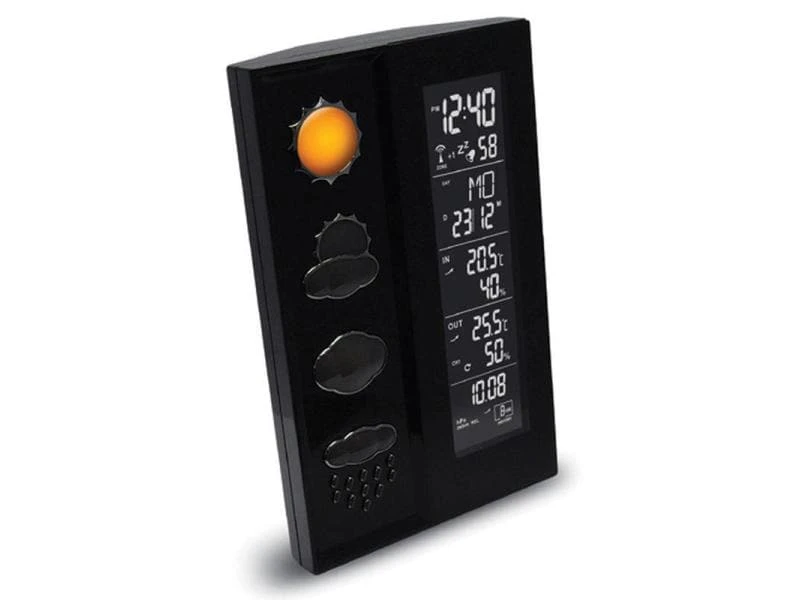 Die Funkuhr hat eine 12-/24-Stunden-Anzeige. Des Weiteren können Sie das Datum und die Wochentage in sieben verschiedenen Sprachen anzeigen lassen. Sie werden über die Innen- und Aussentemperatur in Grad oder Fahrenheit informiert. Auch Informationen zur Innen- und Aussenluftfeuchte erhalten Sie mit dieser Station. Verschiedene Wettersituationen werden Ihnen dank der 3D-Symbole exakt vorhergesagt. Lassen Sie sich über den entsprechenden Luftdruck informieren und nutzen Sie den Weckalarm mit Schlummerfunktion. Sie werden rechtzeitig über den anstehenden Batteriewechsel informiert. Die Wetterstation ist zum Aufstellen gedacht und wird mit einem Aussensender geliefert. Für den Betrieb werden insgesamt fünf AAA-Batterien benötigt. Diese sind im Lieferumfang nicht enthalten.