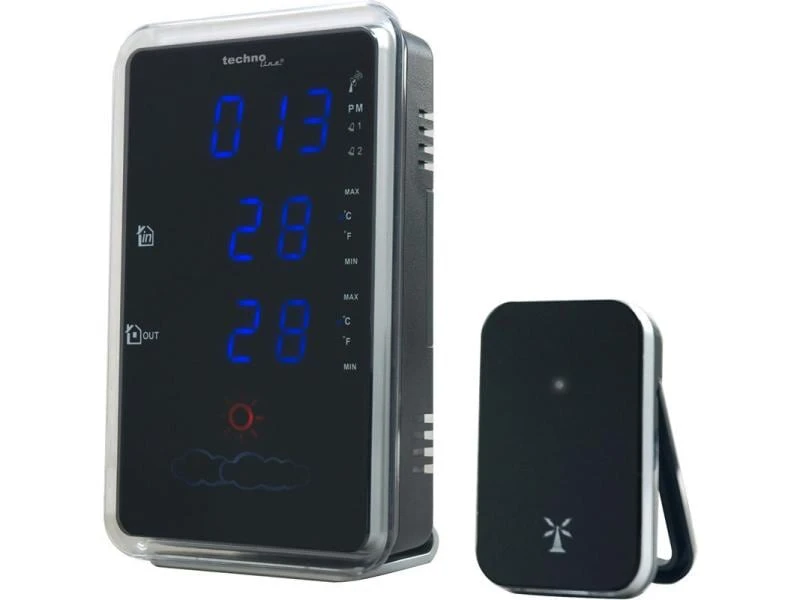 Die WS 6840 Wetterstation von Technoline mit manuell einstellbarer Funkuhr zeigt Ihnen die Zeit im 12- oder 24-Stundenformat an. Sie erhalten zudem Informationen über die Innen- und Aussentemperatur sowie eine Vorhersage von Wettersituationen und Tendenzen. Die Helligkeit des Displays ist in zwei Stufen einstellbar. Darüber hinaus sind zwei Weckalarme mit Schlummerfunktion integriert. Die Stromversorgung erfolgt über das mitgelieferte Netzteil. Für den dazugehörigen Aussensender benötigen Sie zwei AAA-Batterien. Die maximale Übertragungsreichweite zwischen Aussensender und Station beträgt 30 Meter.