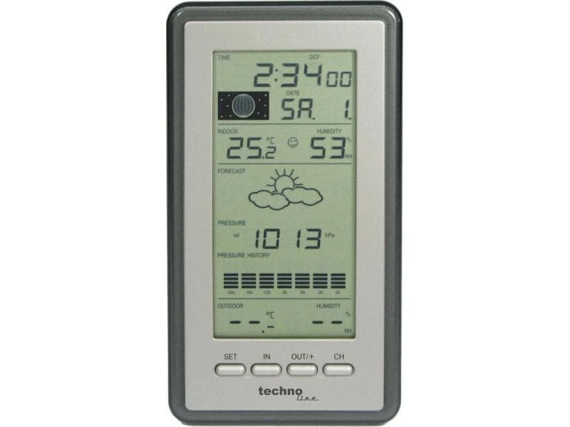 Die WS 9040-IT Wetterstation von Technoline zeigt Ihnen die Innentemperatur in Grad Celsius oder Grad Fahrenheit sowie die Innen- und Aussenluftfeuchtigkeit an und verfügt über eine Luftdruckanzeige mit einer 24-h-Historie. Mit dem Wohlfühlindikator haben Sie den Zustand des Raumklimas immer im Blick. Es erfolgt eine Min-/Max-Speicherung. Die Vorhersage umfasst auch Wettersituationen und Tendenzen. Das Gerät gibt Ihnen ausserdem auch Auskunft über die Mondphasen und hat eine Batterieendanzeige integriert. Die Übertragungsreichweite zwischen Aussensender und Station beträgt bis zu 100 Meter. Für den Betrieb benötigen Sie vier AA-Batterien. Diese sind im Lieferumfang nicht enthalten.