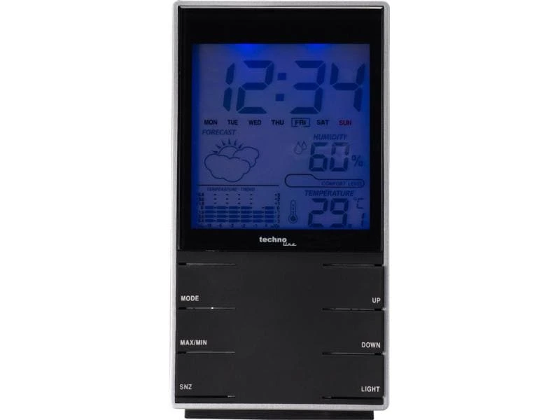 Die Technoline Wetterstation WS 9120 bietet Ihnen ein komplettes Wetterstudio. Zusätzlich können Sie jederzeit die Uhrzeit ablesen. Dank des Wohlfühlindikators sehen Sie zudem auf einen Blick, wie es um das Raumklima steht.