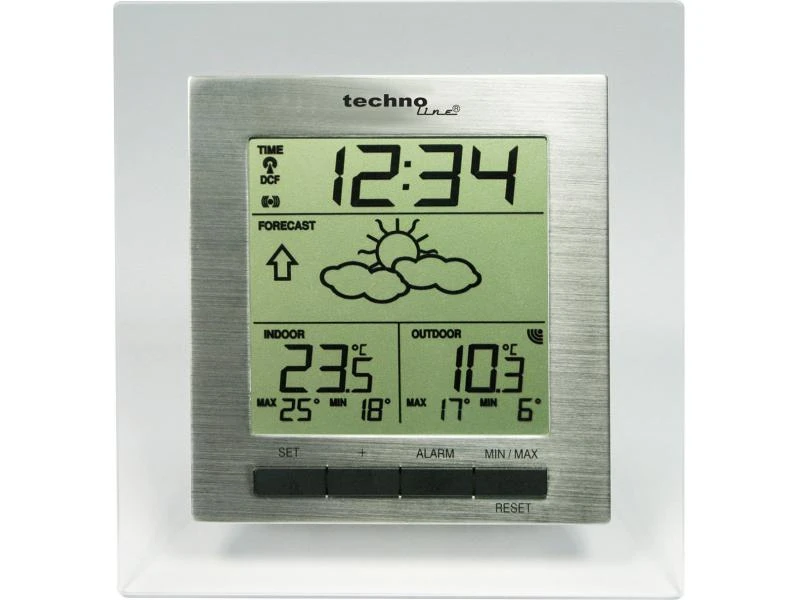 Die schicke Wetterstation WS9136 von Technoline bietet Ihnen eine Vorhersage der Wettersituation und gibt Ihnen eine Einschätzung der Wettertendenz. Neben der Innen- und Aussentemperaturanzeige ist eine gut ablesbare Uhr mit dabei. Auch den Batteriezustand sehen Sie auf dem grossen Display. Für die Aussenmessung ist ein Sender bereits im Lieferumfang enthalten. Zudem ist in der Station ein Wecker mit Schlummerfunktion integriert. Sie können sie sowohl an der Wand aufhängen wie auch auf einem Tisch aufstellen. Der Aussensender benötigt für den Betrieb zwei AAA-Batterien, die Station zwei AA-Batterien. Diese sind nicht im Lieferumfang enthalten.
