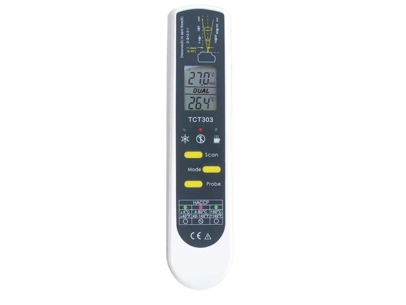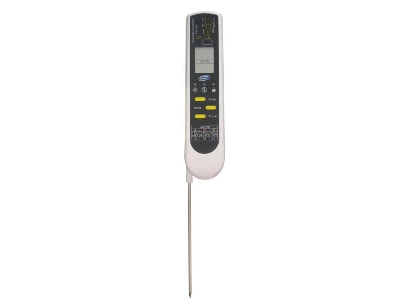Mit dem DualTemp Pro messen Sie die Temperatur wahlweise berührungslos über Infrarot oder mit dem Einstechfühler. Die Messwerte werden Ihnen dabei auf dem übersichtlichen LC-Display angezeigt. Mit einem Messbereich von minus 55 bis plus 250 °C eignet sich das Gerät für eine vielzahl von Anwendungen. Zudem ist es gemäss IP65 Schutzart gegen Strahlwasser geschützt.