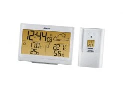 Mit fünf Symbolen werden Sie über das aktuelle und das kommende Wetter informiert. Die Temperaturen können Sie sich wahlweise in Celsius oder in Fahrenheit anzeigen lassen. Des Weiteren bekommen Sie Informationen zu den Mondphasen, dem Sonnenauf- und -untergang, dem Luftdruck sowie zum Datum. Lassen Sie sich zusätzlich über die Luftfeuchtigkeit in Ihrem Heim informieren und mit der Komfortzonenanzeige erfahren Sie auf einen Blick, ob das Raumklima in Ordnung ist. Der integrierte Wecker ist mit einer Schlummerfunktion versehen und mit dem Hintergrundlicht können Sie auch bei Nacht alle Daten leicht ablesen. Die Wetterstation können Sie sowohl auf einem Tisch aufstellen wie auch an der Wand montieren. Für den Betrieb benötigen Sie zwei AA-Batterien (Station) und zwei AAA-Batterien (Aussensensor). Diese sind im Lieferumfang nicht enthalten.